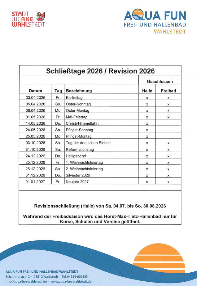 Hier gelangen Sie zu unserem Freibad Wahlstedt, welches von Mai bis September geöffnet ist. Das Freibad…